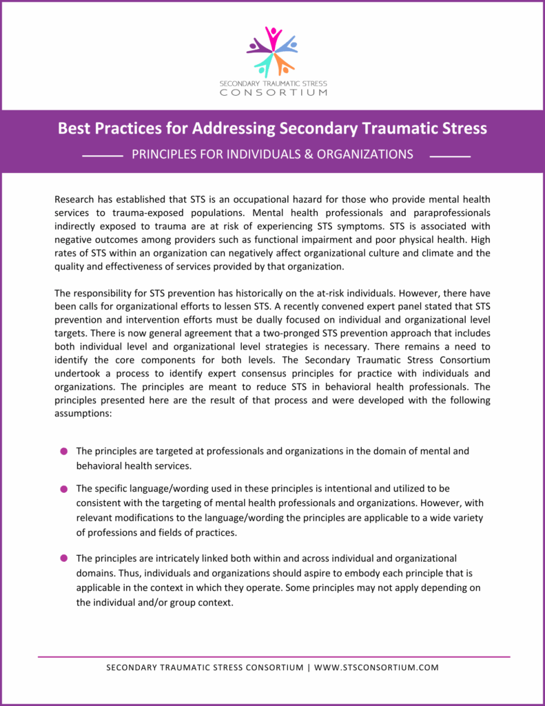 Published by the STS Consortium in 2024, these principles offer best practices for addressing secondary traumatic stress for both individuals and organizations.